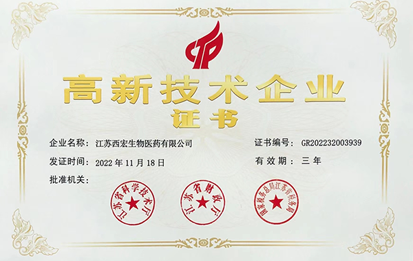近日,全國高新技術(shù)企業(yè)認(rèn)定管理工作領(lǐng)導(dǎo)小組辦公室公布了2022年第三批高新技術(shù)企業(yè)名單,江蘇西宏生物醫(yī)藥有限公司(下稱“西宏醫(yī)藥”)通過審批,獲得“高新技術(shù)企業(yè)”資質(zhì)認(rèn)定。