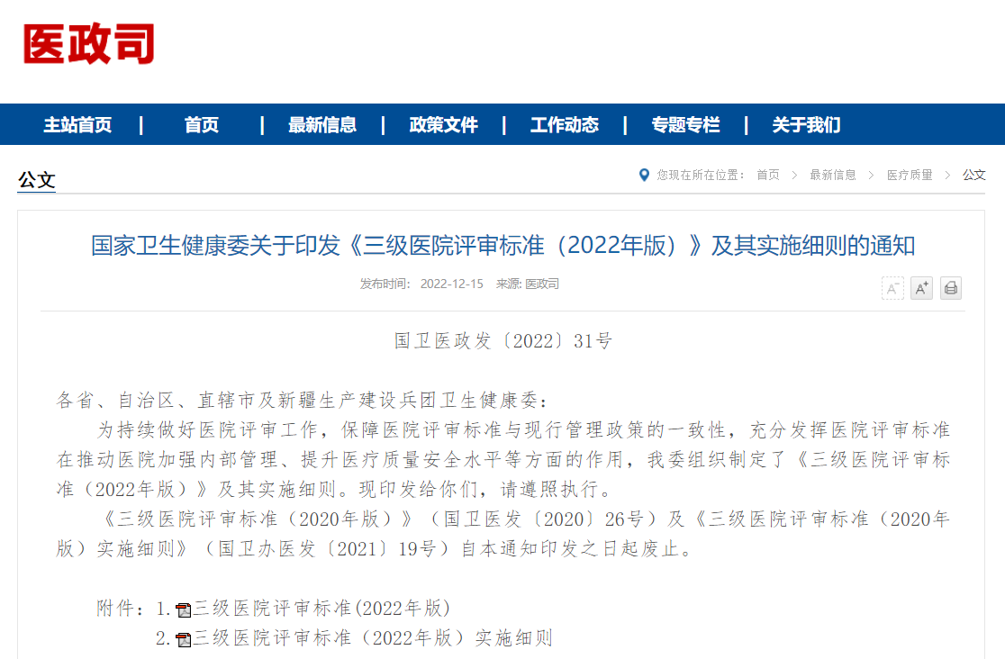 近日,國家衛(wèi)生健康委辦公廳印發(fā)了《三級(jí)醫(yī)院評(píng)審標(biāo)準(zhǔn)(2022年版)》及其實(shí)施細(xì)則,通知如下: