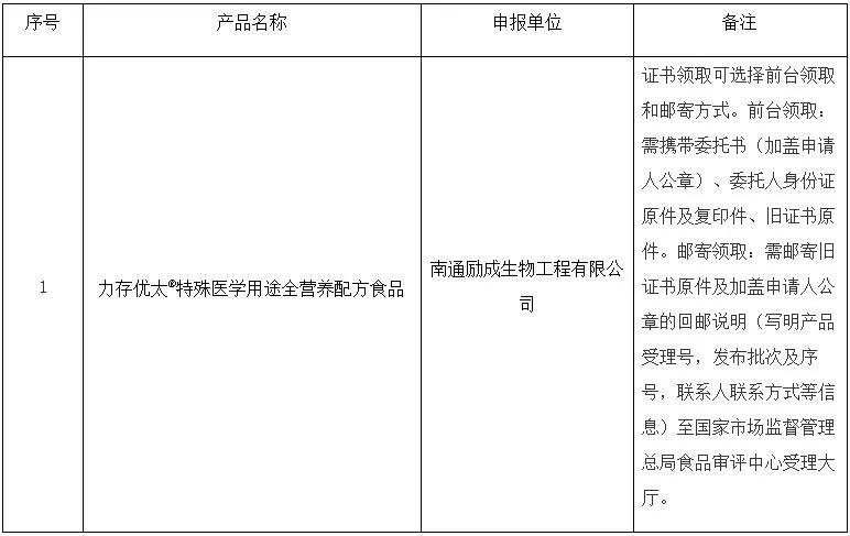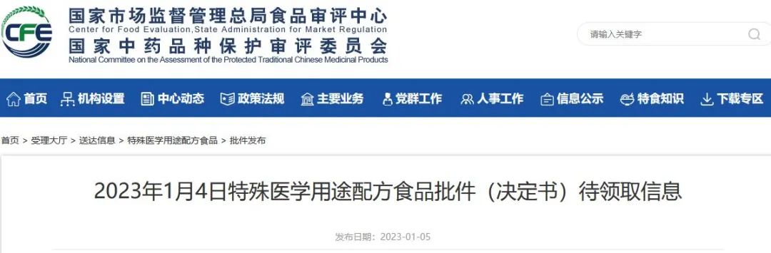 2023年1月4日,國家市場監(jiān)管總局食品審評中心發(fā)布了1款特殊醫(yī)學用途配方食品批件(決定書)的待領取信息,詳情如下: