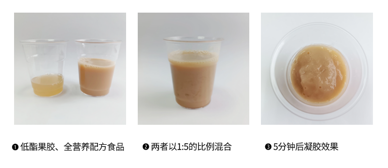 「低酯果膠」在鈣離子(Ca2+)存在的條件下即可形成凝膠,臨床上常用的腸內營養(yǎng)制劑基本都含Ca2+,恰好與低酯果膠的凝膠條件匹配。